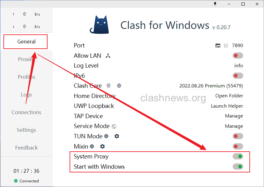 当我们导入完订阅,选择完代理模式和节点,以及给节点做完延迟测试后,表示我们一切就绪,就可以前往【General】里面,开启【System Proxy】中文叫系统代理,就可以开启海外代理, 畅享海外所有资源了: